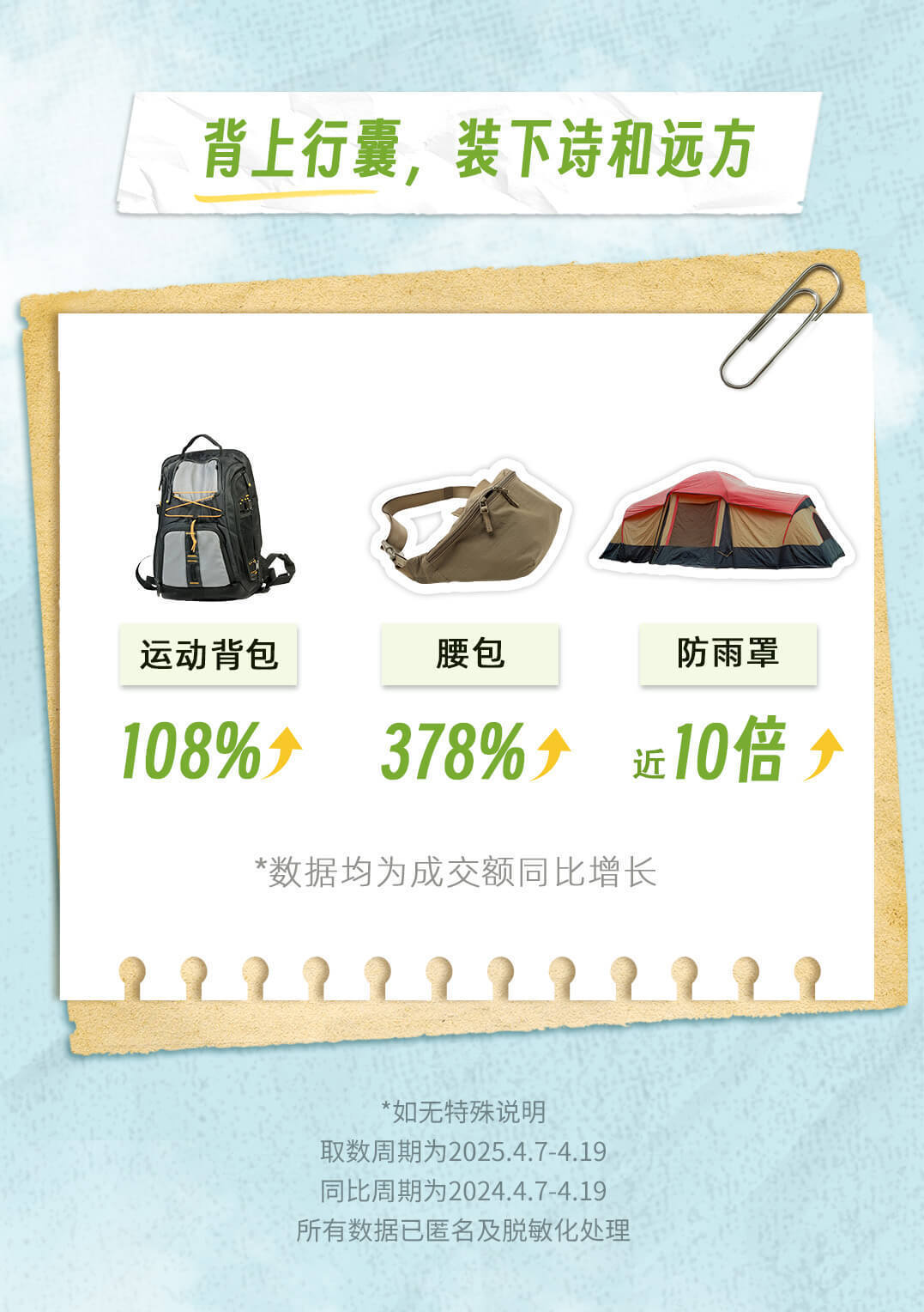 户外出行热度飙升,户外装备市场迎来销售热。抖音电商数据显示,兼具实用性与时尚感的运动背包备受消费者喜爱,成交额同比增长 108%。小巧便携的腰包凭借其便捷收纳优势,成交额同比增长 378%。面对户外多变天气,露营防雨装备需求激增,防雨罩成交额同比增长近十倍。